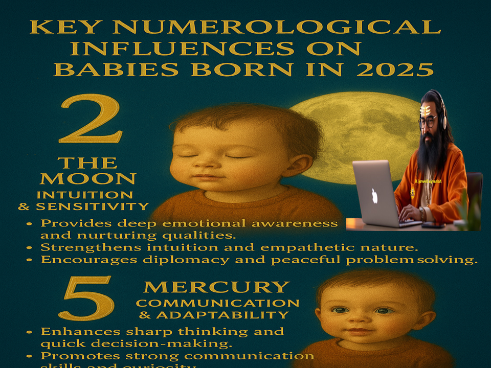 Combining the powerful energies of number 5 (Mercury) and number 2 (Moon) present in the year 2025, babies born in this year are uniquely positioned for financial success, adaptability, and harmonious relationships. Their ability to think quickly, communicate effectively, and maintain emotional balance gives them an edge in both professional and personal spheres. Along with their own birth date and Life Path numbers, the year’s universal energies make it highly auspicious for the emergence of wealth, success, and abundance.