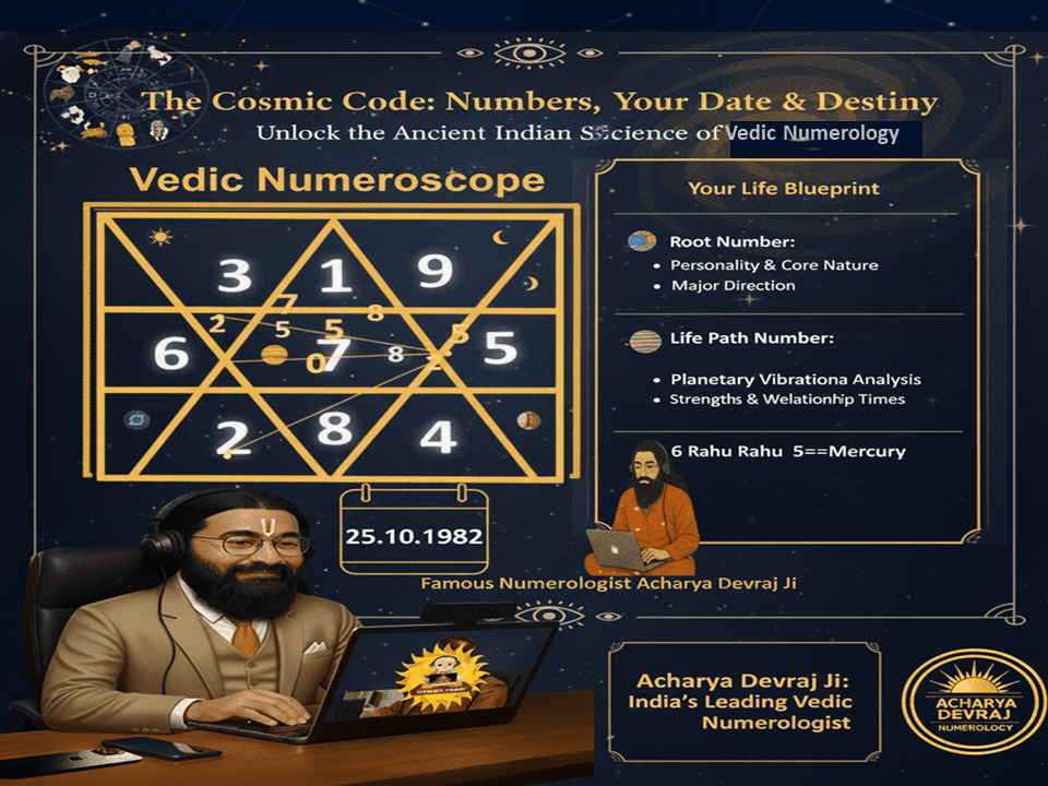 Vedic Numerology uses your date of birth to create a detailed numerology chart, known as the numeroscope, which reveals your Root Number, or Mulank Number, Life Path Number, and planetary influences. By analyzing the numeroscope, planetary periods (Mahadasha and Antardasha), and special number Rajyog combinations, India’s expert Vedic numerologists like Acharya Devraj Ji provide accurate predictions about your past, present, and future — helping you understand your personality, career path, and life purpose with scientific precision and Vedic wisdom.